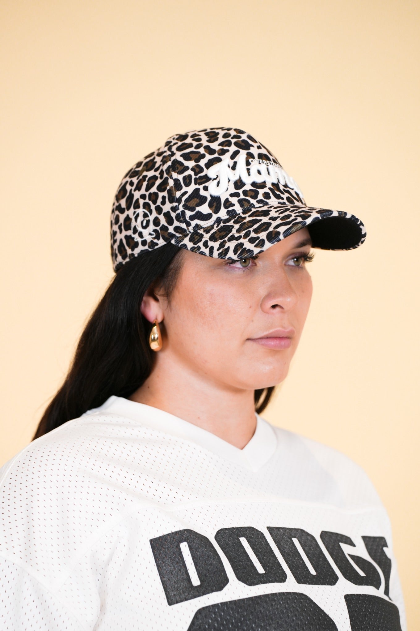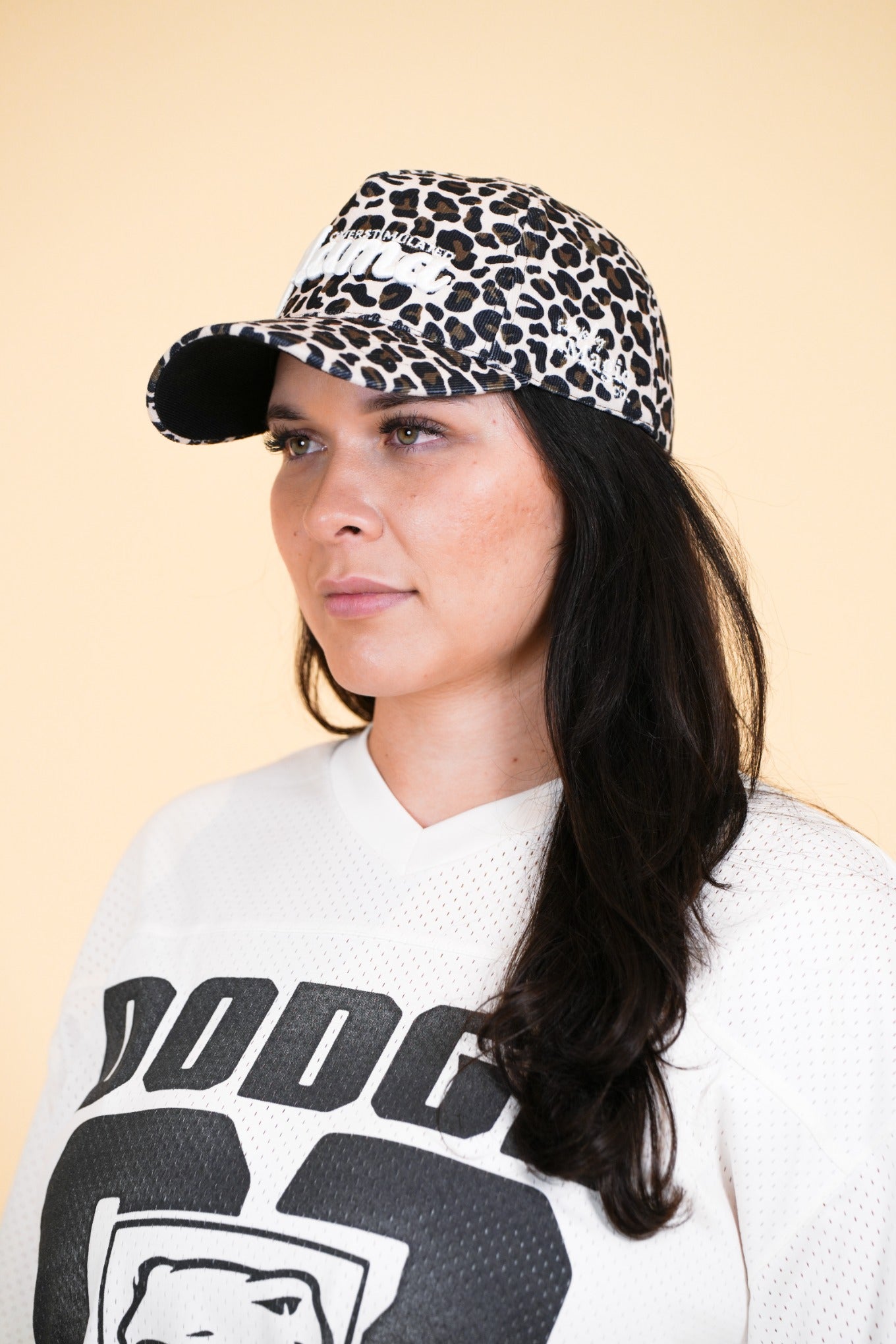 โข Cream with a cheetah corduroy bill