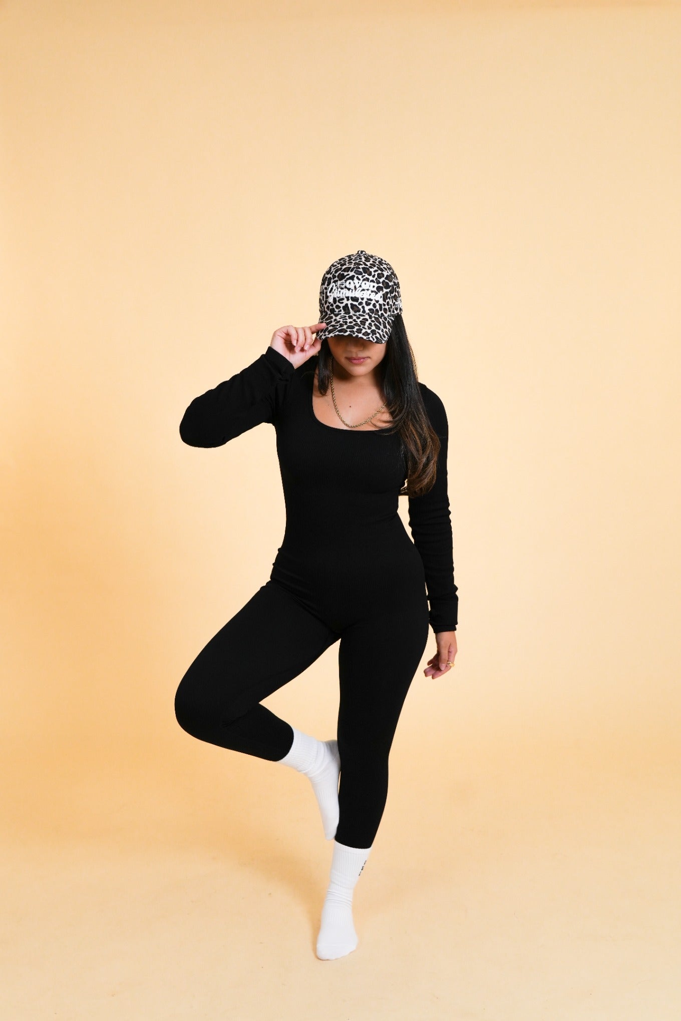 โข Cream with a cheetah corduroy bill